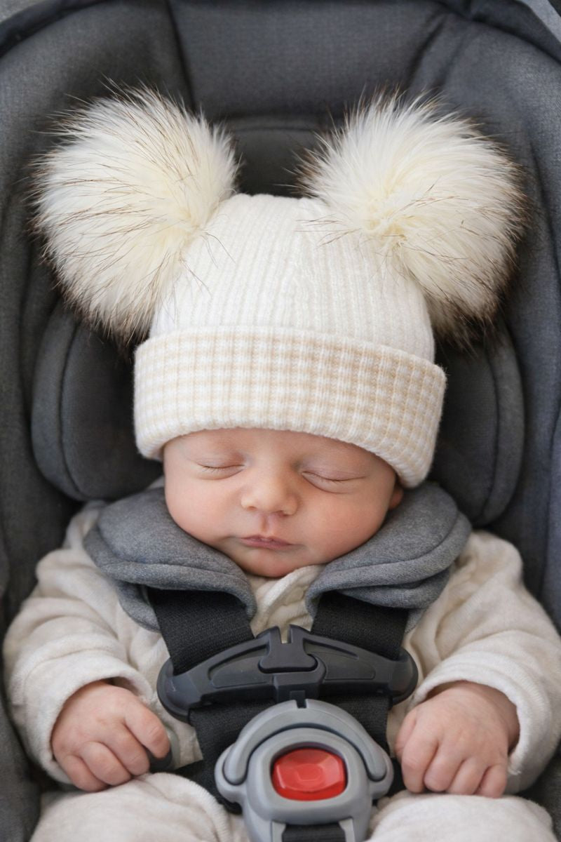 Beige & White kids personalised Double Pom hat - First Size