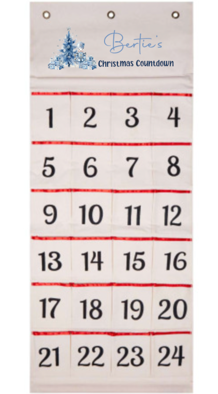 Introducing our Personalised Advent Calendar – the perfect way to count down to Christmas in style! Standing approximately 1000mm tall, this charming advent calendar features 24 spacious pockets, each waiting to be filled with your own unique surprises. Whether you want to tuck in sweet treats, small toys, or heartfelt notes, this calendar is designed to bring daily joy throughout December.