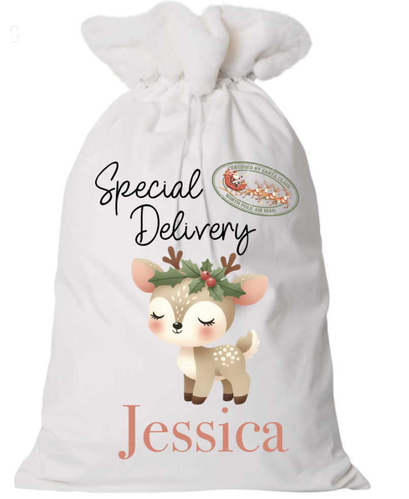Measuring approx. 50x70cm these sacks are great for gift giving with your choice of name & printed design to the front for that something extra special