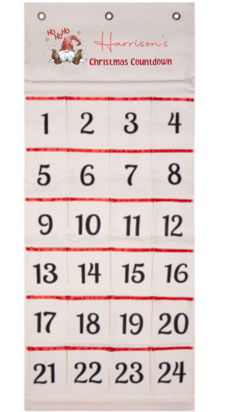 Introducing our Personalised Advent Calendar – the perfect way to count down to Christmas in style! Standing approximately 1000mm tall, this charming advent calendar features 24 spacious pockets, each waiting to be filled with your own unique surprises. Whether you want to tuck in sweet treats, small toys, or heartfelt notes, this calendar is designed to bring daily joy throughout December.