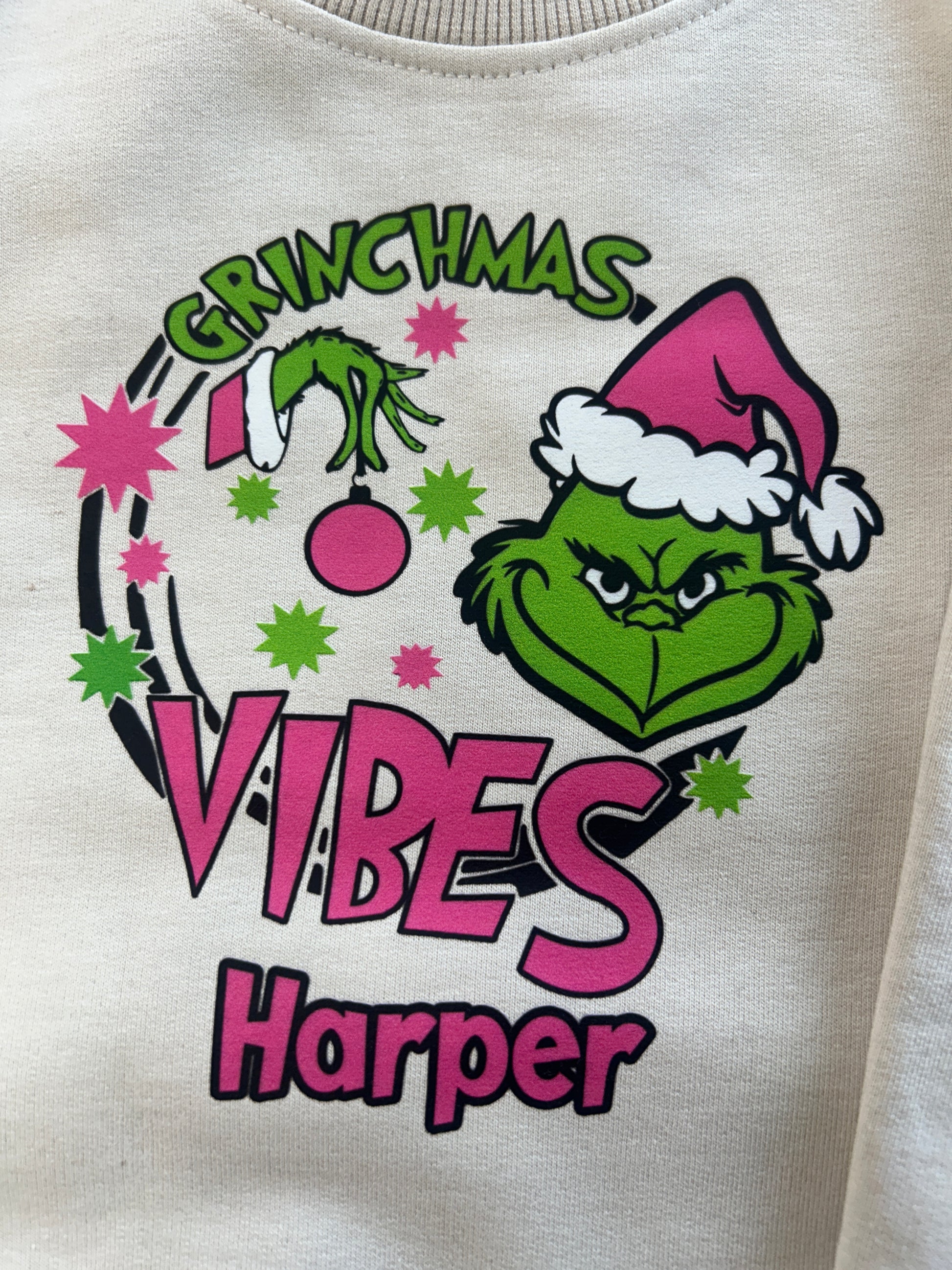 Our cosy personalised kids sweater features a fun printed Grinch design on the front, with the option to add your child’s name for that extra-special touch.